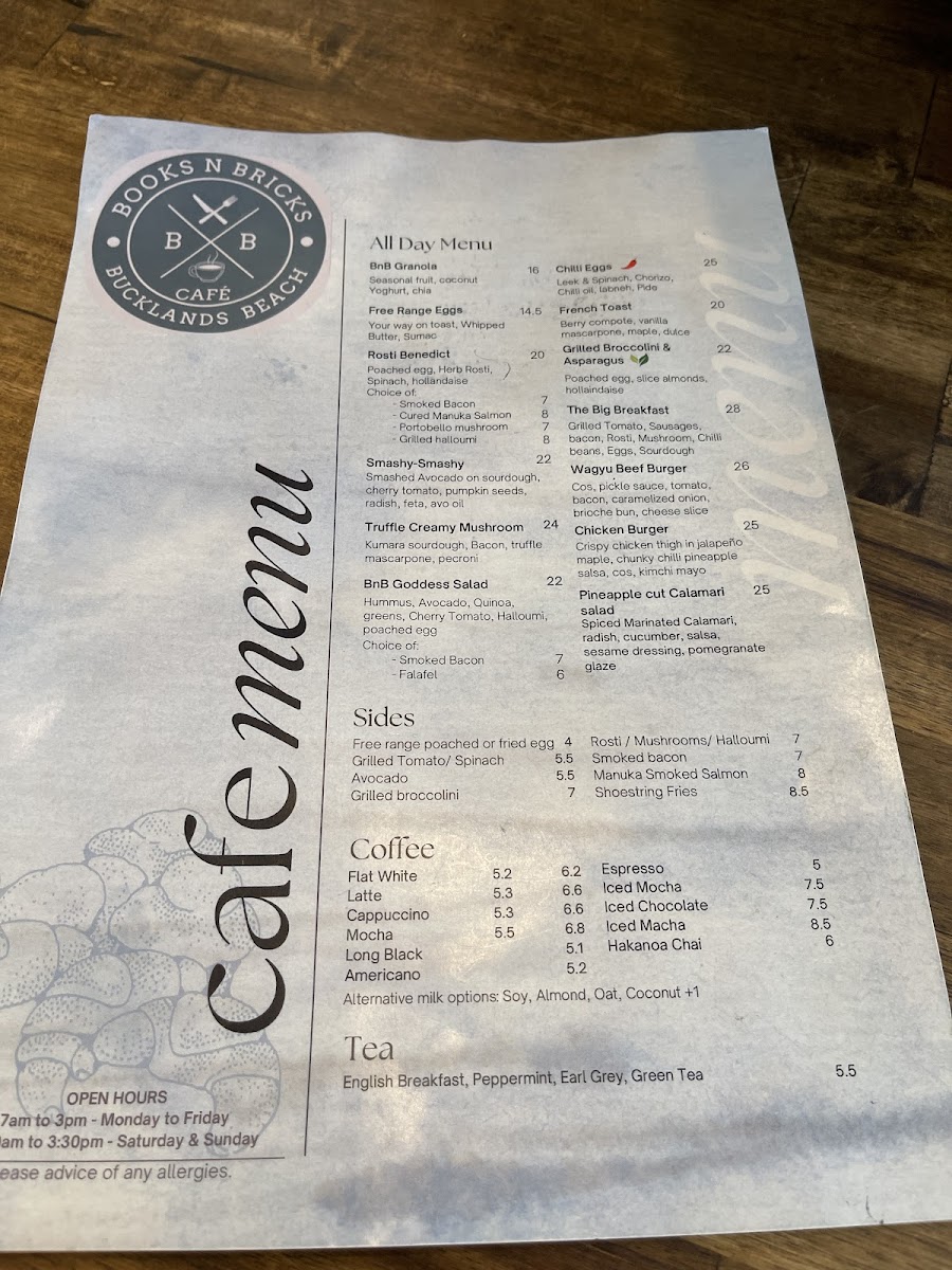 The menu at Books N Bricks Cafe offers a variety of options suitable for breakfast, brunch, and light meals throughout the day. It is structured into several categories including an all-day food menu, a selection of teas, and items available from the cabinet.